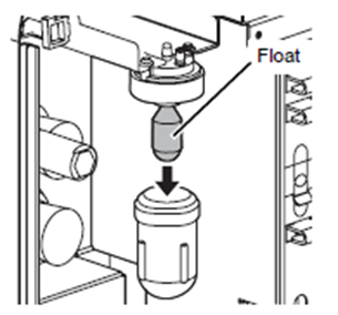 PROCEDURE 1. Open top front cover. 2. Remove pneumatic trap chamber by rotating it in the direction of the arrow. 3. Discard the fluid that is collected. 4. Remove the float, and place it in the pneumatic trap chamber. 5. Attach the pneumatic trap chamber by turning it in the opposite direction from step 2. 6. Close front cover. |